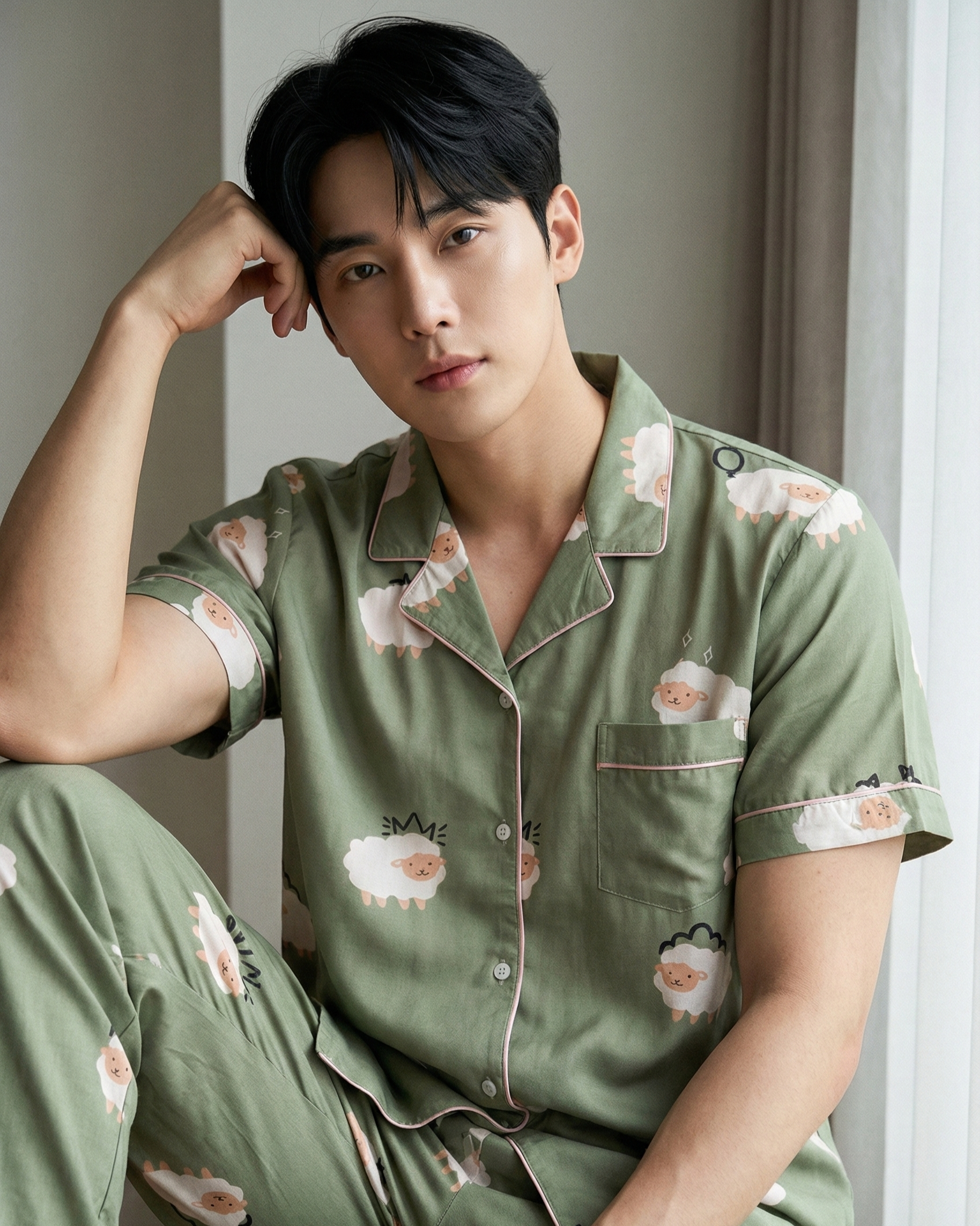 Rediscover the childhood magic of drifting off to sleep with the Baa Baa Nightwear Set, a playful nod to the timeless ritual of counting sheep. Crafted from a luxurious soft cotton blend, this men's nightwear set combines superior breathability with an ultra-smooth touch, perfect for keeping you cool and relaxed through the night. The soothing sage green fabric, adorned with a whimsical flock of fluffy sheep and finished with elegant contrast piping, transforms your ordinary bedtime routine into a stylish statement of comfort.