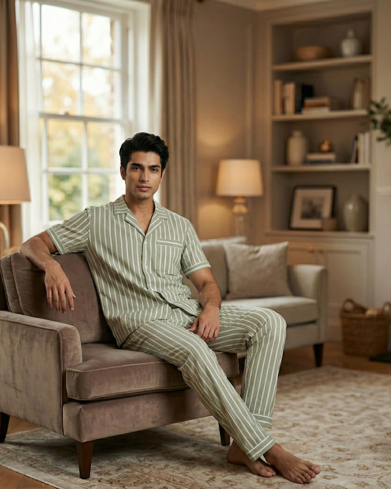 Bring the effortless luxury of a coastal retreat into your personal sanctuary with the Cabana Stripe Nightwear Set. Imagine the feeling of a slow, sun-drenched Sunday morning-coffee in hand, nowhere to be-that is the essence woven into this premium men's ensemble. Crafted from breathable 100% cotton, the fabric offers a crisp, cool touch, featuring soothing sage green and white stripes that visually detox the mind from a busy day.