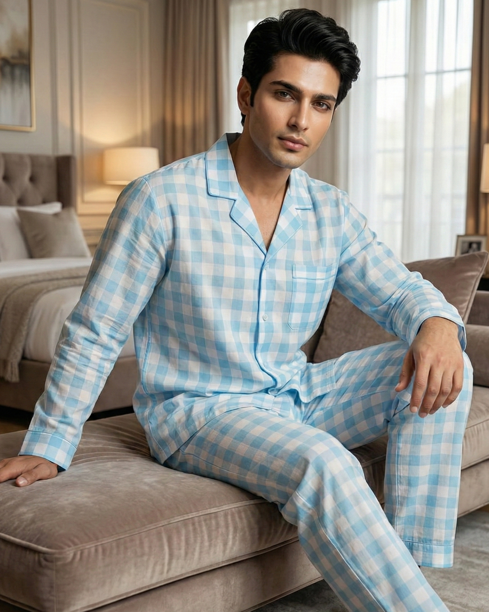 Escape to the serene coast with the Hamptons Blue Checks Nightwear Set, where luxury meets laid-back living. Crafted from premium 100% cotton, this men's ensemble offers a touch of crisp, cool breathability, perfect for warm evenings or relaxing weekends at home. The soothing azure and white gingham pattern mimics the calm of an ocean breeze, visually turning your bedroom into a private sanctuary.