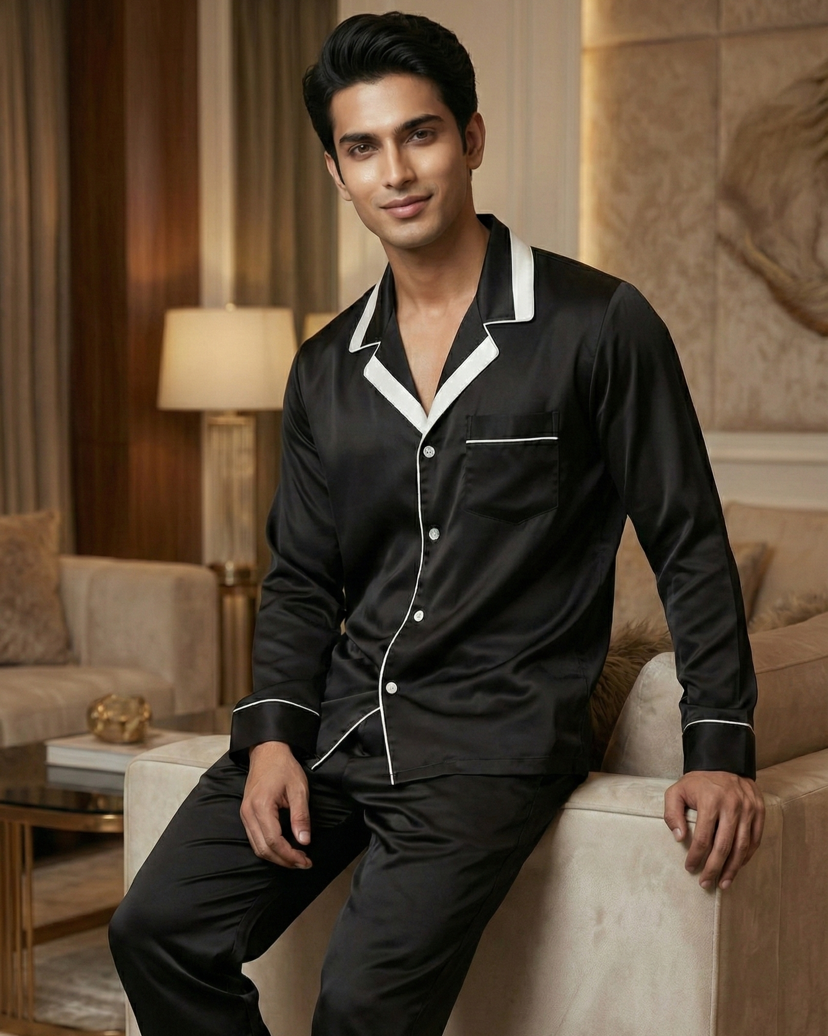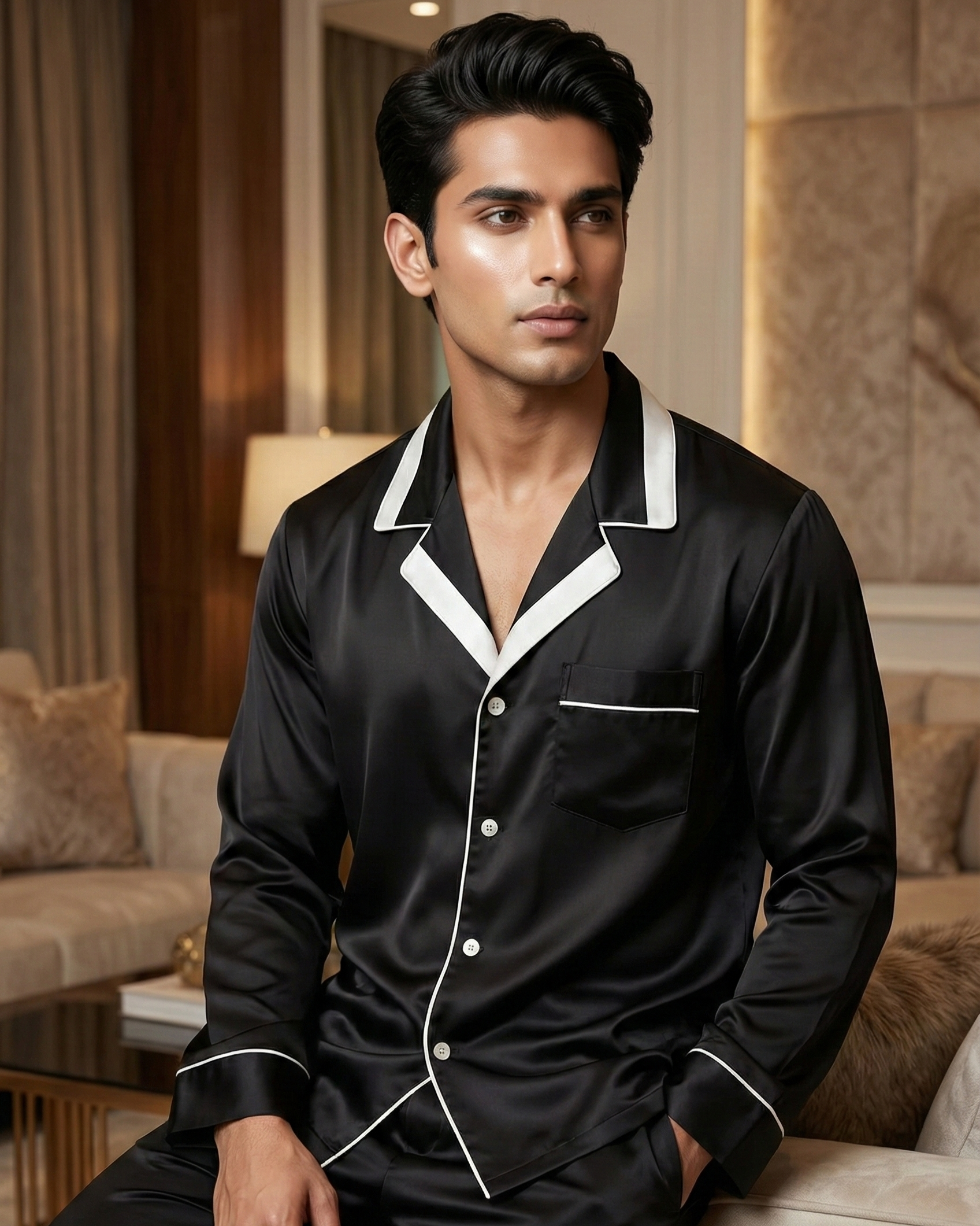 Elevate your evening ritual with the Monochrome Satin Set, where classic sophistication meets ultimate comfort. As the noise of the day fades, slip into the cool, liquid embrace of this luxurious men's nightwear set. Crafted from lustrous black satin that glides effortlessly against the skin, it features sharp white piping that frames the silhouette with timeless elegance, reminiscent of old-world glamour. This isn't just comfortable sleepwear; it's a statement of refined relaxation. The relaxed shirt and tailored trousers with functional pockets make it ideal cozy loungewear for savoring a late-night drink in your study or drifting into a deep, restorative slumber. Experience the profound shift in mindset that premium fabric brings to your downtime. Why settle for the ordinary when you can indulge in the extraordinary? Transform your nightly routine into a five-star experience and wake up feeling refreshed and commanding.