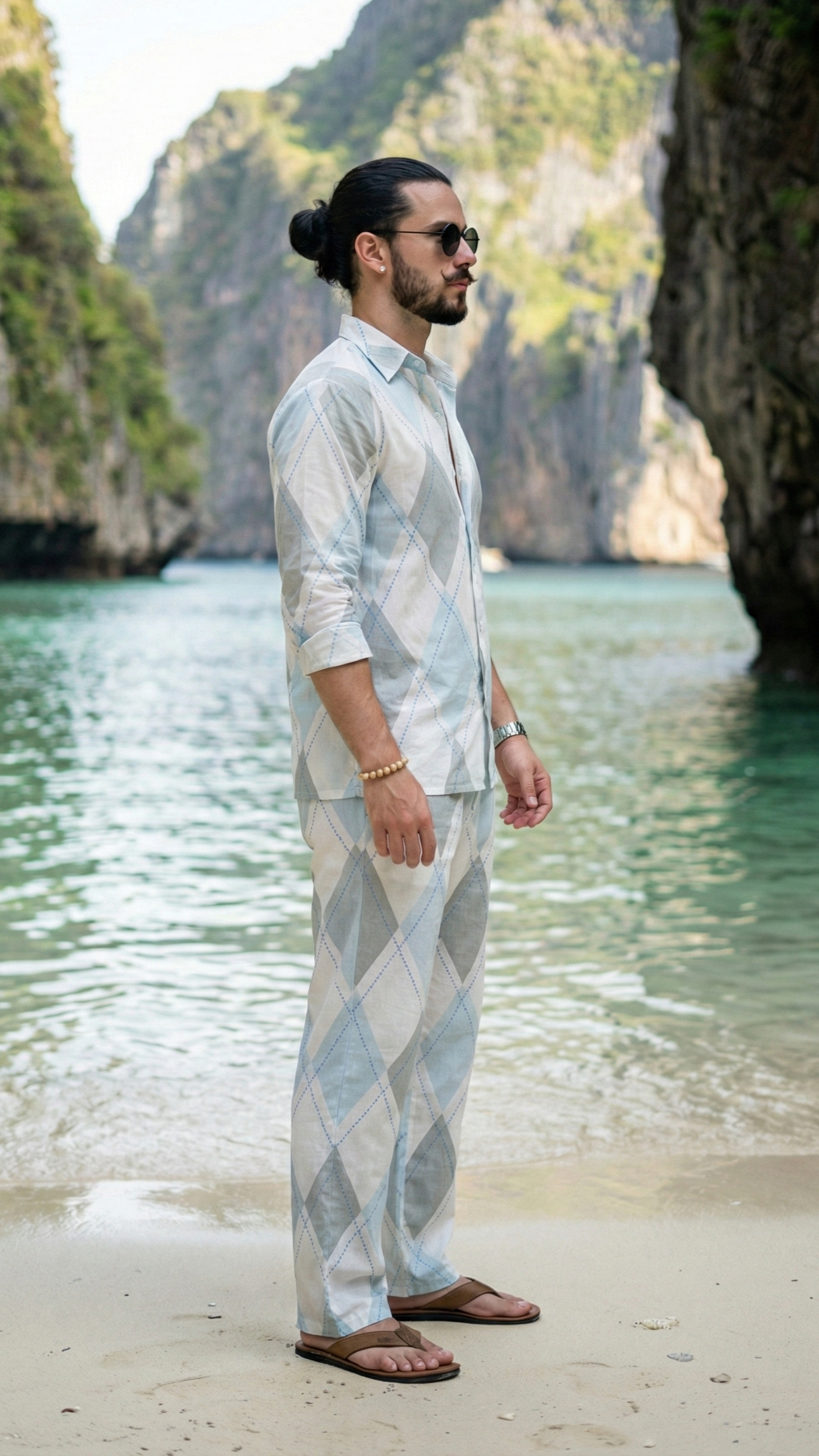 The design commands attention with its sophisticated oversized diamond check pattern—a harmonious blend of ocean blues, slate greys, and crisp whites that mirrors the hues of the sea. This isn't just clothing; it is a versatile travel companion. Seamlessly transition from a relaxed afternoon on the sands to sipping cocktails at a high-end beach bar without missing a beat. The relaxed fit allows for unrestricted movement, making it perfect for long flights or spontaneous adventures.